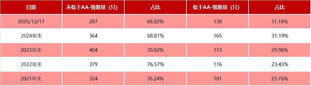 不過,需要注意的是,近年來,隨著優(yōu)質(zhì)銀行轉(zhuǎn)債的批量退出,存量轉(zhuǎn)債信用評級整體呈現(xiàn)弱化趨勢。Wind數(shù)據(jù)顯示,截至12月17日,評級低于AA-級轉(zhuǎn)債的數(shù)量有130只,占比31.18%,而轉(zhuǎn)債發(fā)行數(shù)量較高的2021年和2022年,該比例分別為23.76%和23.43%。